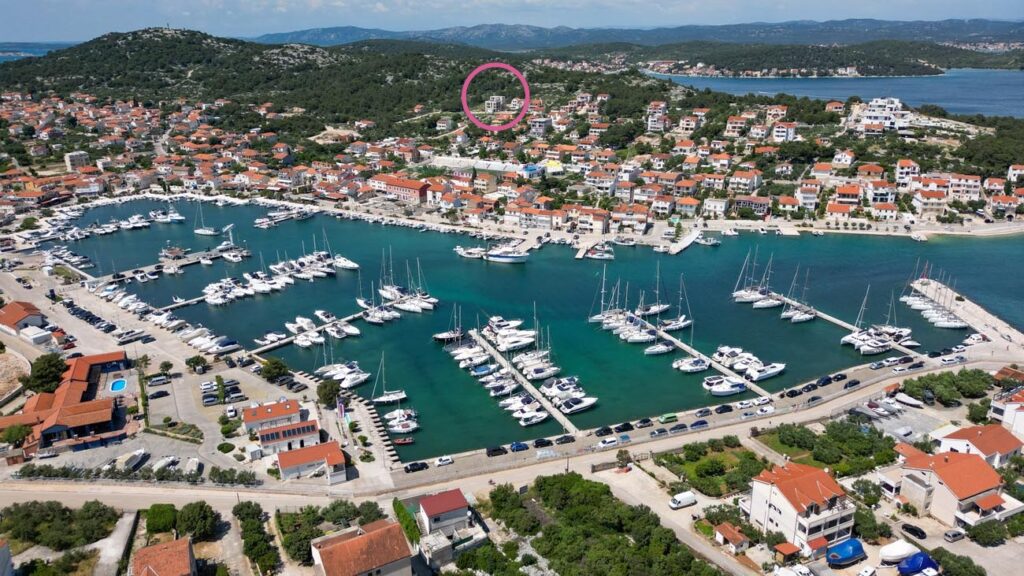 Lokacija Lake Rezidence je sjajna, pa osim pogleda na more, marinu dolje, u centru , u Jezerima te blage padine otoka Murtera, udaljenost do centra nije daleko, svega cca 330m, cestom oko 500m.