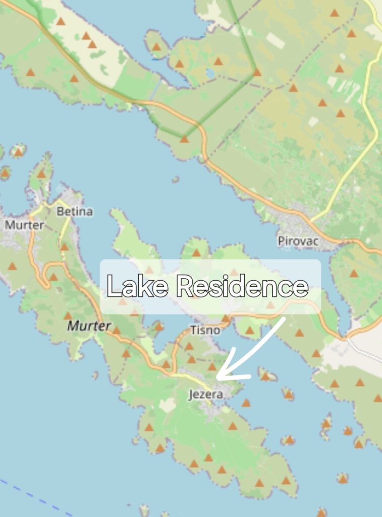 Lokacija Lake Rezidence je sjajna, pa osim pogleda na more, marinu dolje, u centru , u Jezerima te blage padine otoka Murtera, udaljenost do centra nije daleko, svega cca 330m, cestom oko 500m.